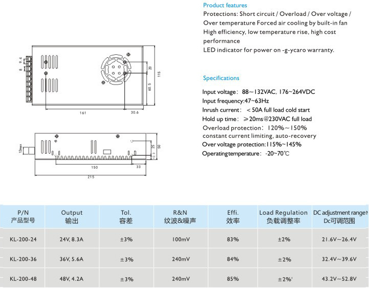 過(guò)電壓保護/過(guò)電流保護/過(guò)溫保護內置風(fēng)扇冷卻