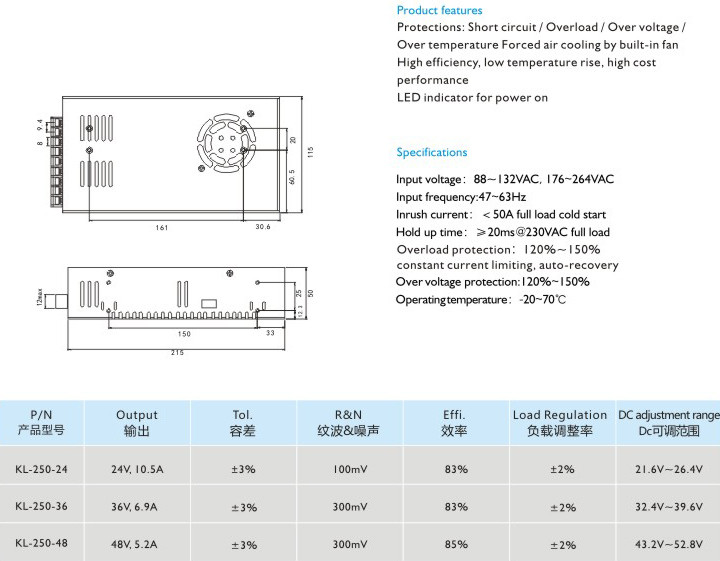 過(guò)電壓保護/過(guò)電流保護/過(guò)溫保護內置風(fēng)扇冷卻